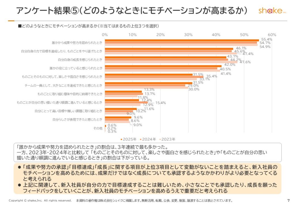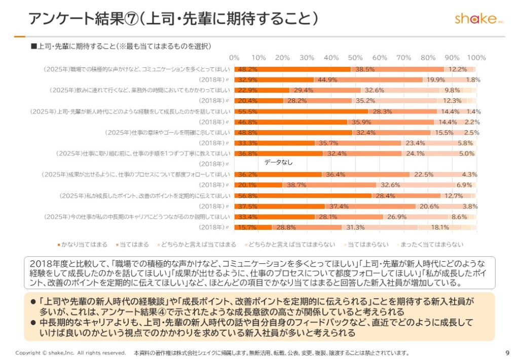 このデータからも言えるように、今年の新入社員は、以前よりも「成果や努力を認められたい(承認されたい)、丁寧にかかわってほしい」と感じている傾向が強くなっています。
